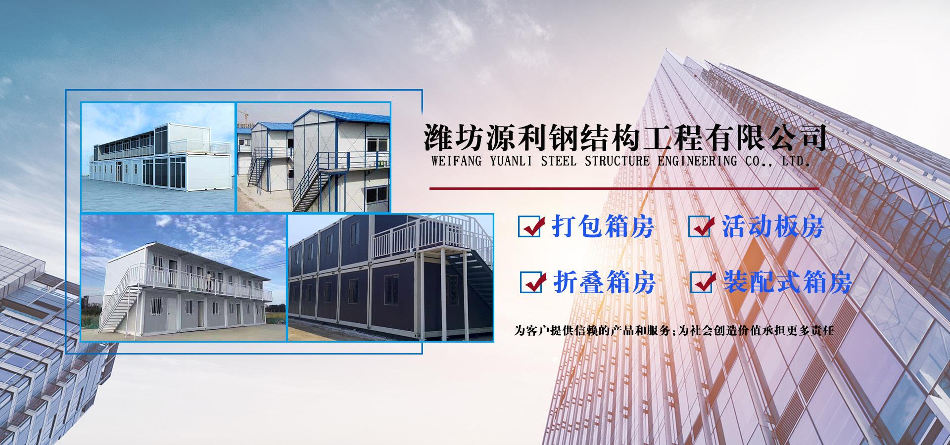 濰坊源利鋼結(jié)構(gòu)工程有限公司成立于2015年,是一家從事活動房屋,鋼結(jié)構(gòu)設(shè)計、制作、安裝為一體的公司。公司坐落于風(fēng)景秀麗的藍寶石之鄉(xiāng)昌樂開發(fā)區(qū),占地約60畝,年加工生產(chǎn)能力到40萬平米,現(xiàn)已發(fā)展成本地較大的鋼結(jié)構(gòu)企業(yè),同時也已跨入集成房屋研發(fā)、推廣企業(yè)行列。公司配備了全套的箱房流水線生產(chǎn)設(shè)備,包含了全自動冷彎成型設(shè)備、流水自動涂裝線、沖壓型材生產(chǎn)線以及全套的配套設(shè)備,標(biāo)準(zhǔn)化、模具化生產(chǎn)加工,年生產(chǎn)5000套打包箱,產(chǎn)品保障。 公司主要產(chǎn)品有:鋼結(jié)構(gòu)工程加工、制作、安裝;各類活動板房、打包箱房、裝配式箱房、折疊箱房、圍擋、料棚、異型H型鋼、屋面板、墻面板、樓承板,C型鋼,Z型鋼;馬路隔離護欄等相關(guān)產(chǎn)品。